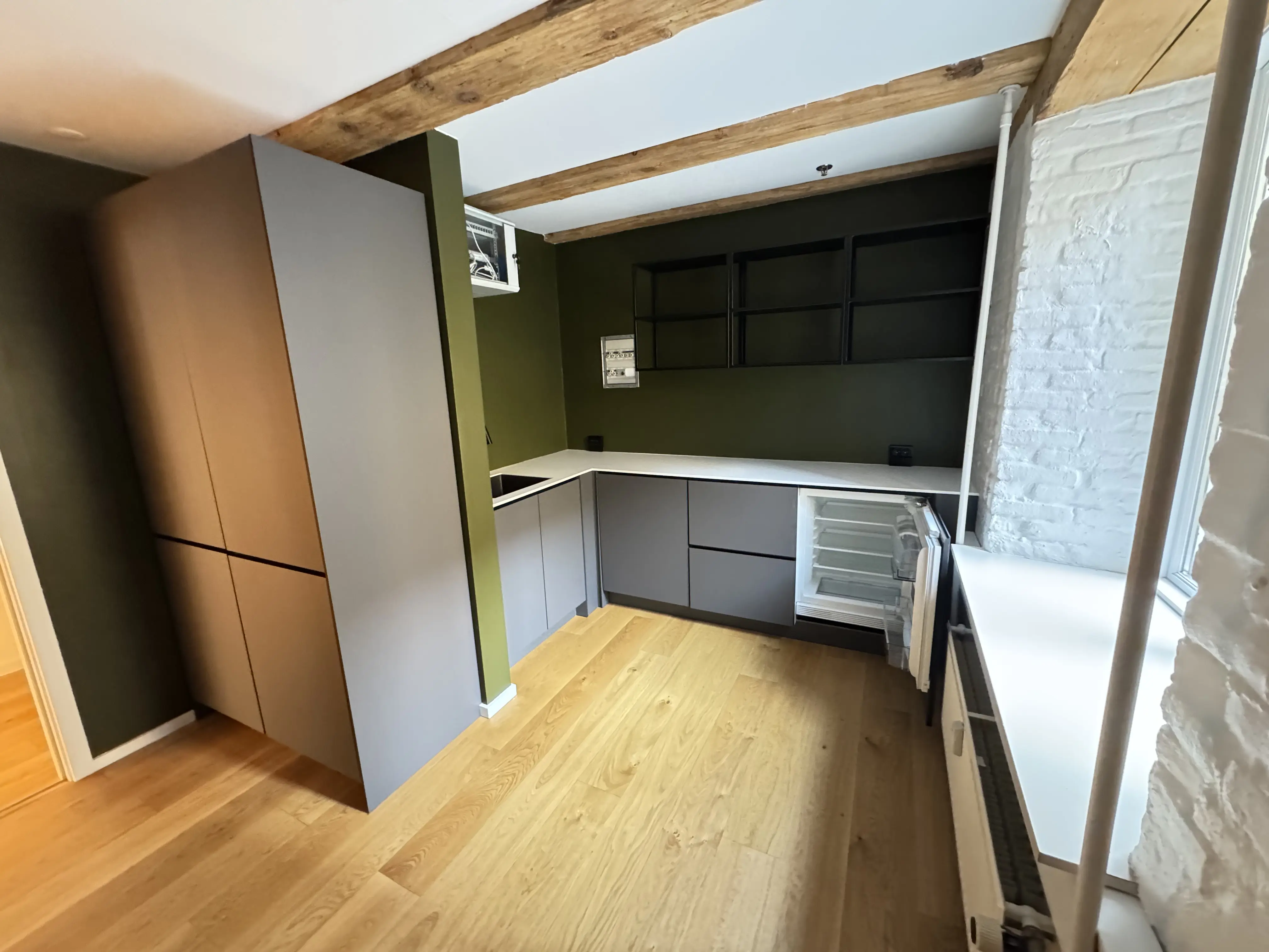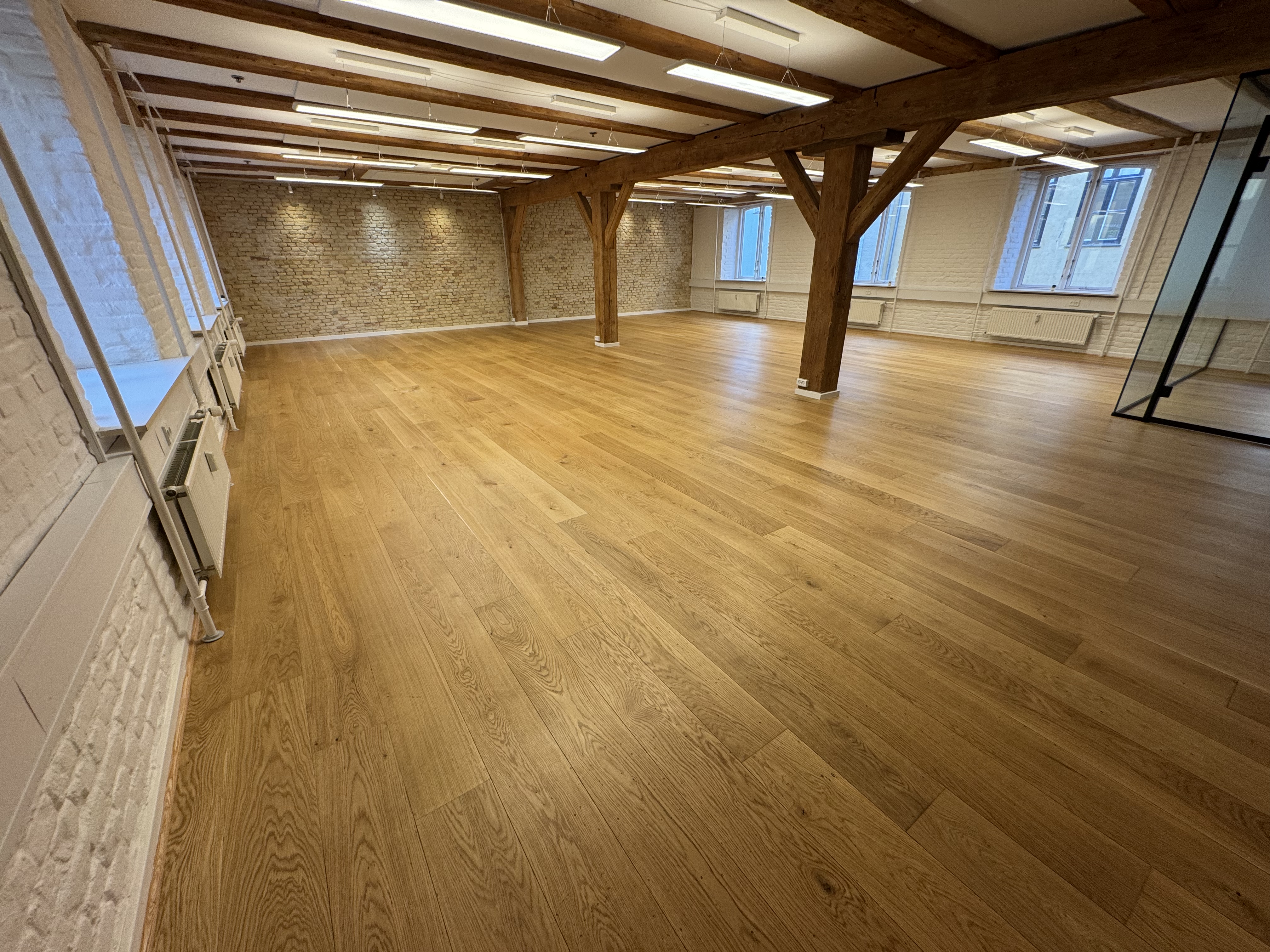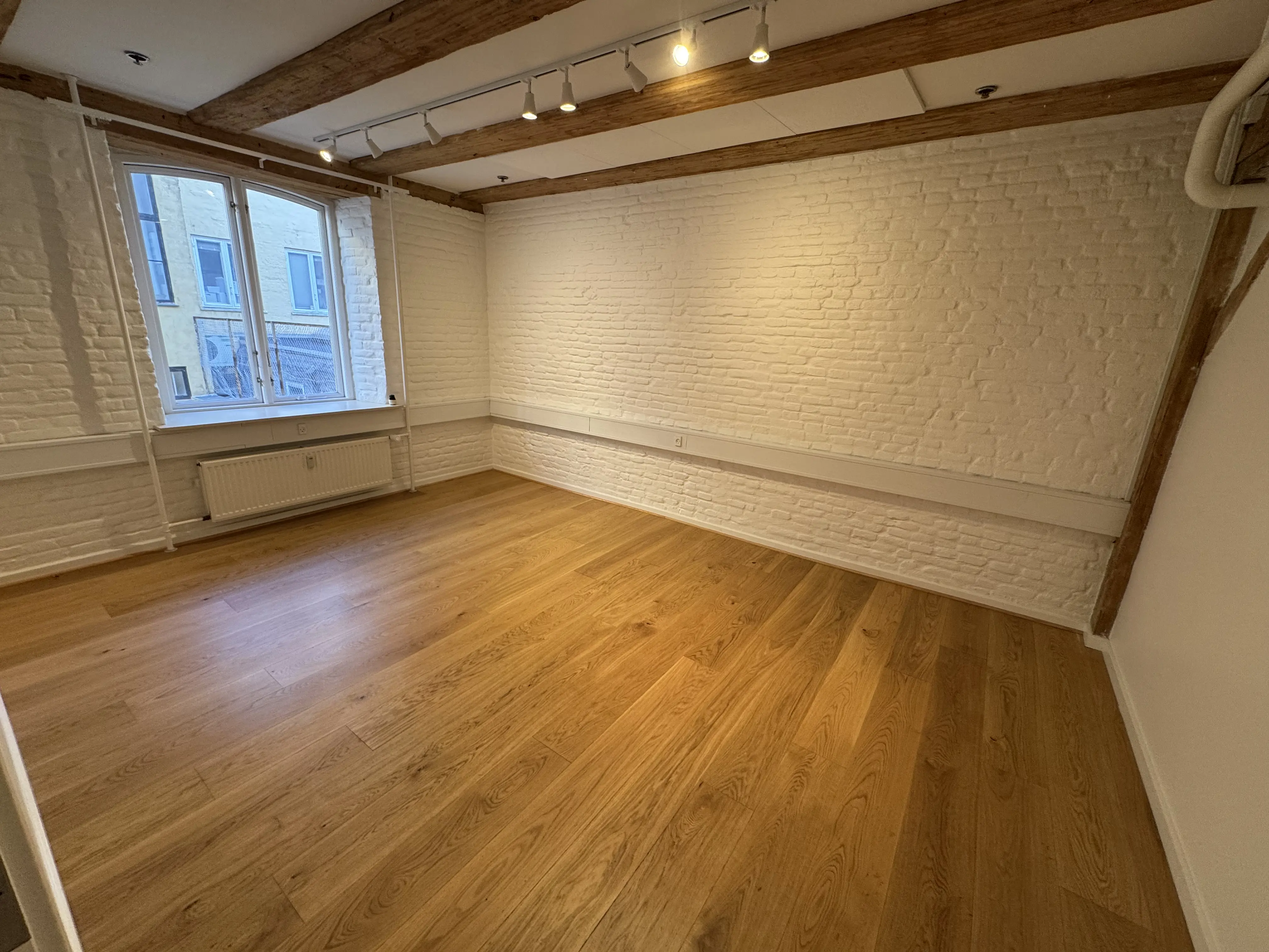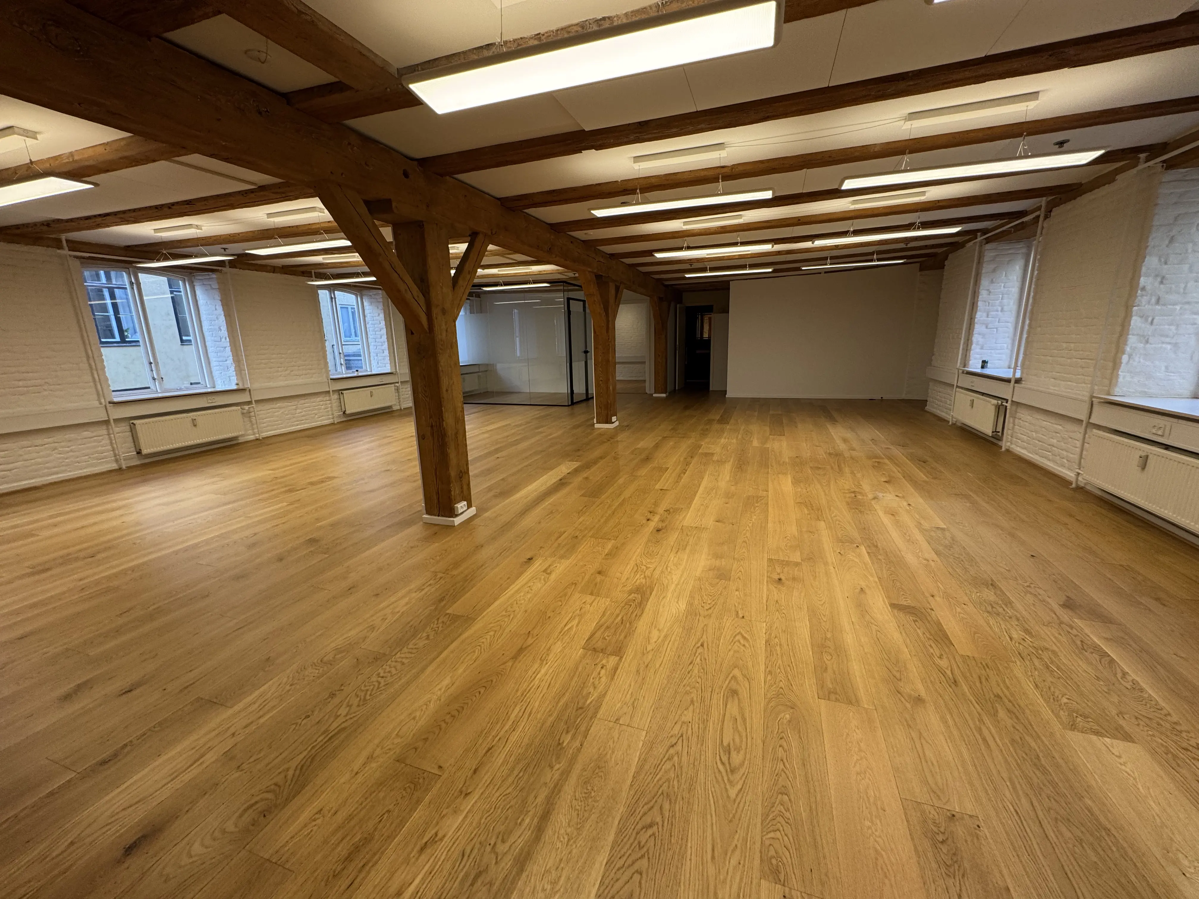 Udvendigt totalt renoveret og moderniseret, så bygningen står smukt og stilfuldt med synlige gamle bjælker.