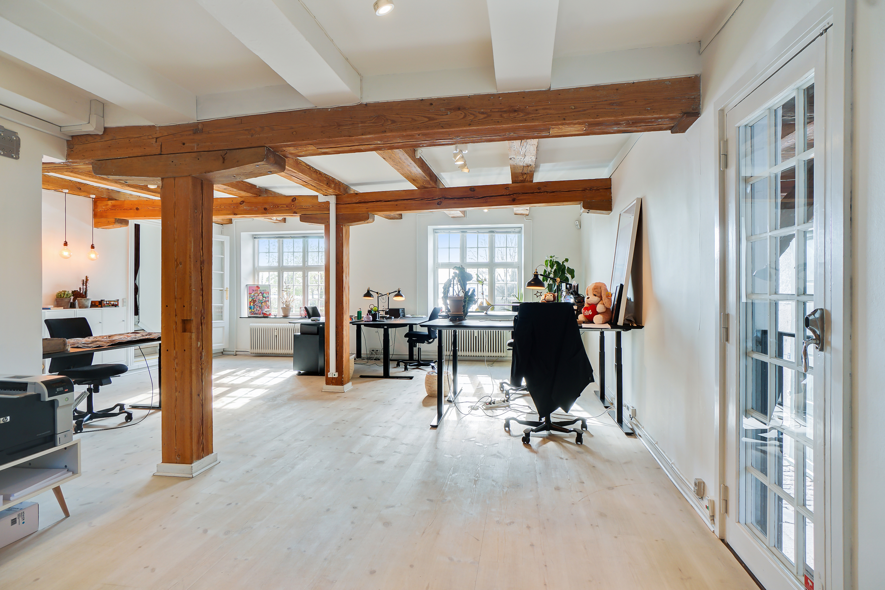 • Historisk pakhus fra 1800-tallet i flot stand med synlige gamle bjælker.